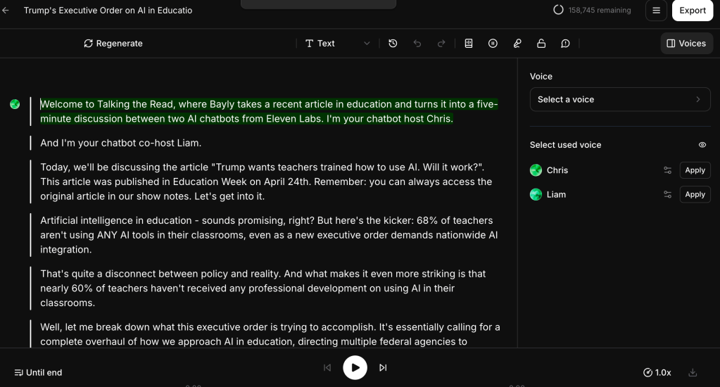 If you’re not savvy with recording software, no big deal. What ElevenLabs generates is still an impressive final product and just as effective for teachers trying to differentiate some of their class reading material.